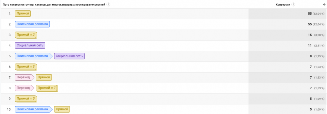 Еще один отчет в Analytics — по ассоциированным конверсиям — покажет, как часто источник трафика становился вспомогательным — то есть, как часто он был одним из источников на пути к конверсии.