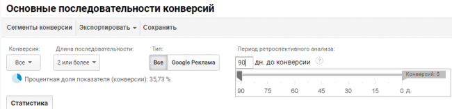 Также можно выбрать период до конверсии от 1 до 90 дней. Увеличение периода позволит найти дополнительные цепочки взаимодействий. Если вы не меняете период дат, но увеличиваете окно ретроспективного анализа, количество ассоциированных конверсий может измениться.