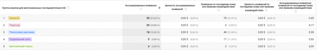Рекомендую обращать внимание еще и на столбец, показывающий отношение количества ассоциированных конверсий к конверсиям по последнему клику или прямому взаимодействию. Чем дальше этот показатель от единицы, тем чаще источник становился вспомогательным. И наоборот, если значение показателя больше нуля, но меньше единицы, значит, что источник трафика был чаще последним взаимодействием перед конверсией.