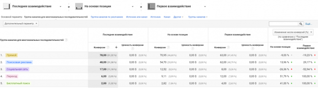 В инструменте сравнения можно одновременно сравнивать три модели атрибуции. На скриншоте ниже видно, что часть пользователей приходит по рекламе, а конверсию совершает через прямой переход.