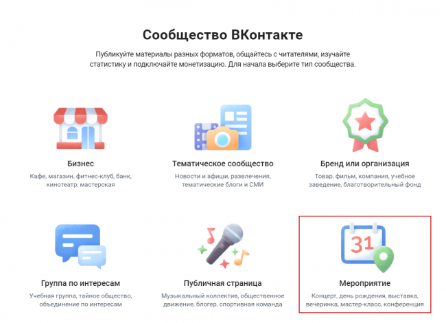 Во «ВКонтакте» есть типы сообществ для разных тематик, целей и задач. Мы выбираем «Мероприятие».
