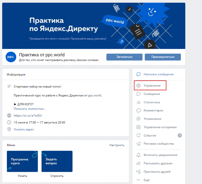 Стандартно адрес отображается в формате https://vk.com/event11111111, но можно придумать «красивый» и читаемые адрес. Мы на странице Практики используем https://vk.com/ppcworldpractice.
