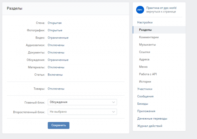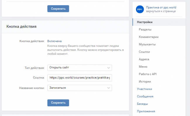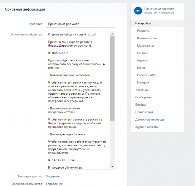 Вы можете дополнить страницу, добавив полезные ссылки, адреса организации, указав участников мероприятия (в случае с концертом — музыкантов) и настроив меню сообщества. Все это можно сделать, открыв соответствующие пункты в меню «Настройки» справа. Здесь же можно ограничить или открыть доступ к определенным разделам, комментариям и историям.