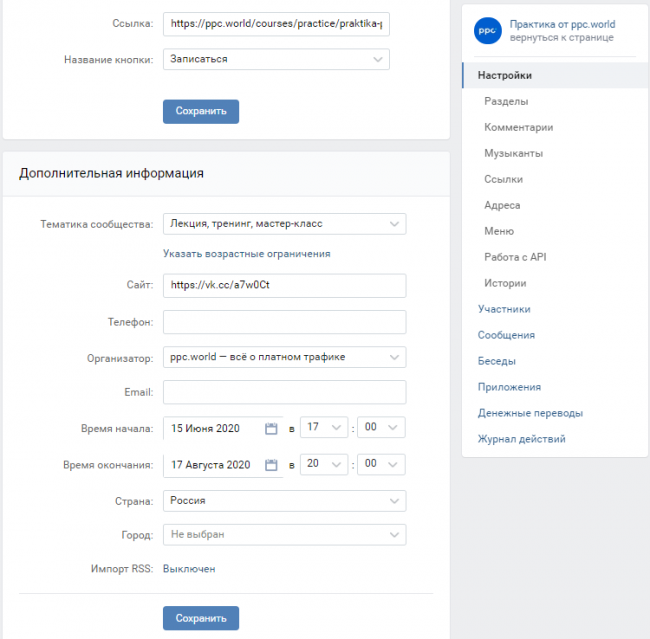 Какую-то информацию мы уже указали при создании страницы мероприятия. Нужно добавить недостающую: