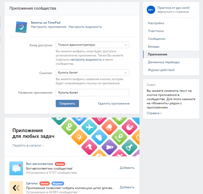 Приложения и виджеты «ВКонтакте» дают участникам дополнительные возможности. В меню справа вы можете настроить следующие элементы: