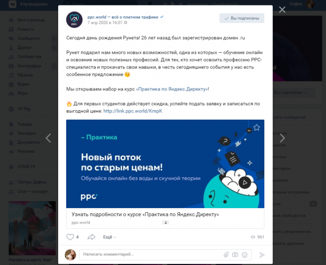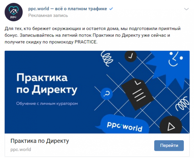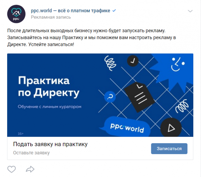 Пример поста в сообществе с рекламой нашего курса «Практика по Яндекс.Директу» Таргетированная реклама во «ВКонтакте». Обеспечит максимально точное попадание в целевую аудиторию, если правильно выполнить настройки кампании. Подробно о том, как настроить таргетированную рекламу во «ВКонтакте» читайте в инструкции.