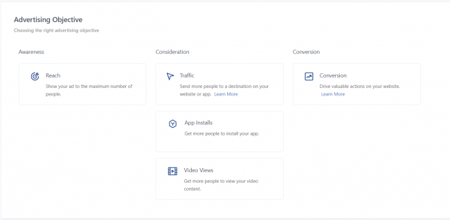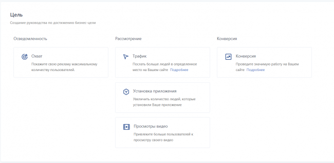 Рекламодателям доступно несколько целей рекламных кампаний, которые позволяют работать с аудиторией на разных этапах воронки и решать различные задачи бизнеса. Выбирайте цель, которая соответствует вашим маркетинговым целям.