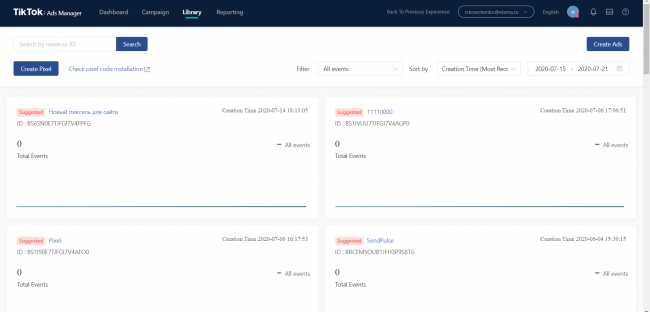 Рекомендую использовать один рекламный кабинет только для одного проекта/сайта. Дело в том, что сейчас в кабинете нет возможности удалять созданные ранее пиксели и, что еще важнее, нельзя выбирать разные пиксели для создания разных аудиторий ремаркетинга.