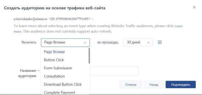 Создание списка ремаркетинга на основе пикселя без возможности выбора пикселя