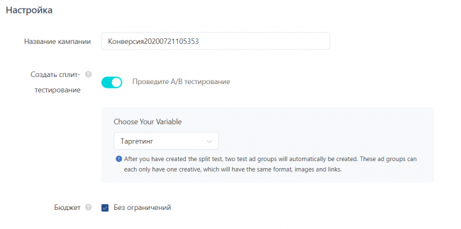 Также есть возможность проведения сплит-тестирования. Однако на сегодня доступен сплит только по таргетингам.