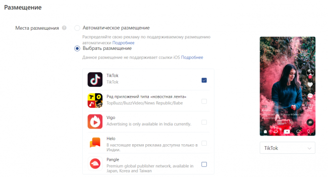 На уровне группы объявлений необходимо выбрать площадки для показа рекламы. С таргетингом на РФ, скорее всего, показы будут идти только в приложении TikTok, но лучше все-таки отключить другие приложения. Тем более что для рекламы в TikTok актуальна только видеореклама, а на некоторых других площадках можно использовать статичные баннеры.