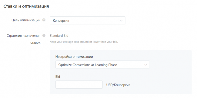 На этапе настройки стратегии рекомендую выбрать цель оптимизации «Конверсии», включить Optimize Conversions at Learning Phase и задать реальную целевую цену за конверсию. Так система сразу будет ориентироваться на привлечение наиболее целевой и конверсионной аудитории.