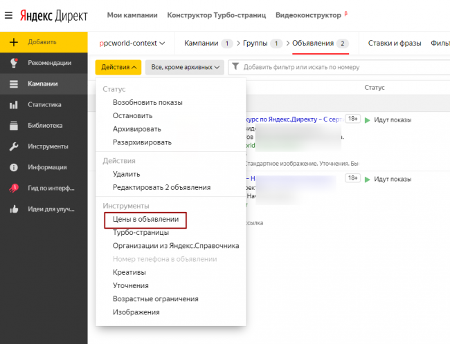 Если нужно добавить цены на уровне кампании или группы объявлений, это можно сделать с помощью массовых действий. На странице «Кампании» отметьте нужные кампании, затем перейдите к объявлениям, выделите нужные или весь список. Далее нажмите «Действия» и выберите «Цены в объявлении».