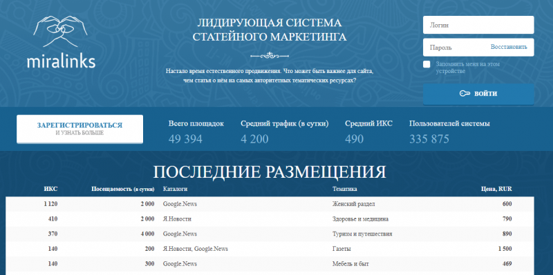 - Miralinks. Самая крупная биржа, на которой можно купить вечные статьи. Подходит для разных видов ресурсов. Оплата веб-мастерам осуществляется на банковские карты, электронные кошельки.