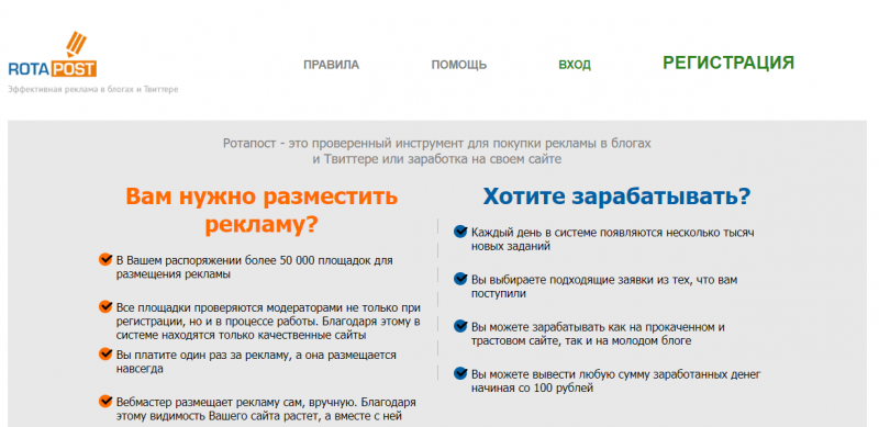 - Rotapost. Известная биржа, где ведется покупка-продажа постовых ссылок. Это линки, которые встраиваются в тексты в блогах на разную тематику. Здесь можно купить постовую ссылку на ресурсах с низким ТИЦ (авторитетностью), а также на блогах, сделанных на бесплатных платформах. Выплаты – на WebMoney, сумма от 100 рублей.