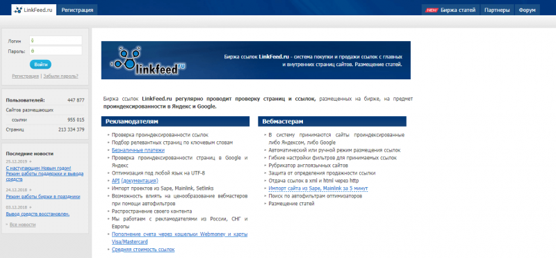 - Linkfeed. Проверенный ресурс, который давно работает. Здесь можно купить и продать разные виды ссылок. Стабильная площадка, но без особых перспектив развития. Вознаграждения выплачиваются по требованию на WebMoney.