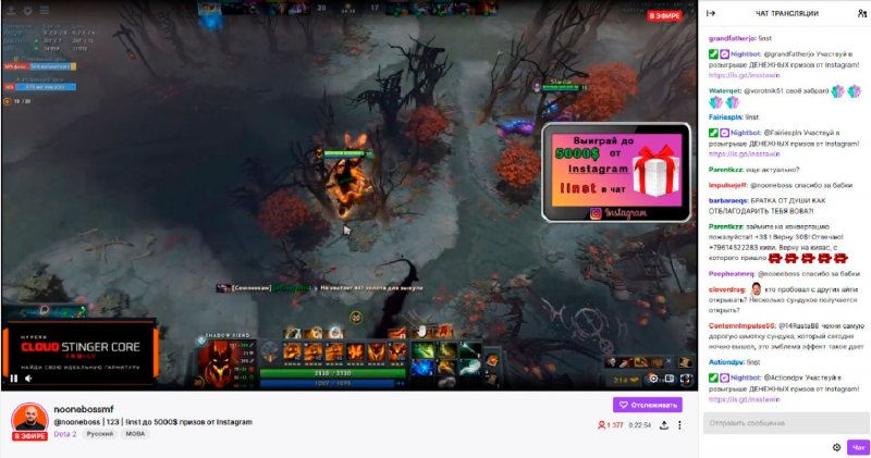 Суть новой мошеннической схемы проста. Злоумышленники находят каналы популярных стримеров и создают похожие по названию, и оформлению аккаунты-клоны. На них мошенники запускают записи стримов с оригинальных каналов, например, недельной давности, «вклеивая» в трансляцию баннер с обещанием легкого заработка, чаще всего с розыгрышем призов. Также преступники публикуют в чате стрима специальную команду (!inst в данном примере), и пользователи, кликнувшие на баннер, отправляются на мошеннический ресурс — например, https: //winstainq[.]dub/draw.