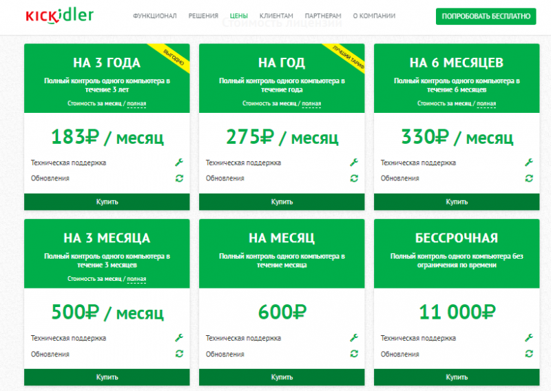 Получение доступа ко всем функциям Kickidler стоит 600 руб. в месяц за одного участника. За эти деньги обеспечивается полный контроль над компьютером. Если оплатить Kickidler на год, то подключение одного участника стоит 275 руб. в месяц.