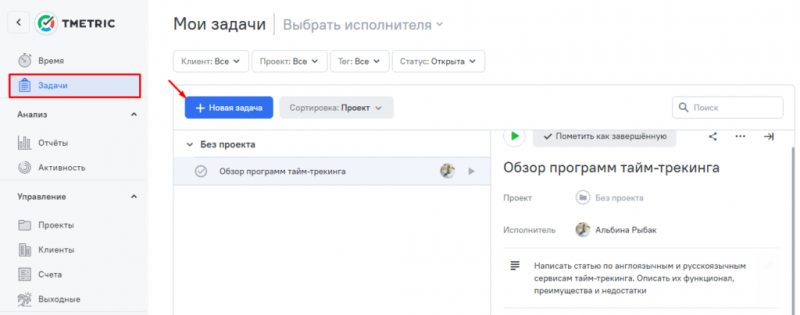 В TMetric можно ставить задачи, следить за активностью участников, формировать отчеты по проектам, задачам, команде, управлять проектами и клиентами, выставлять счета.