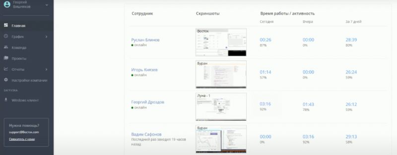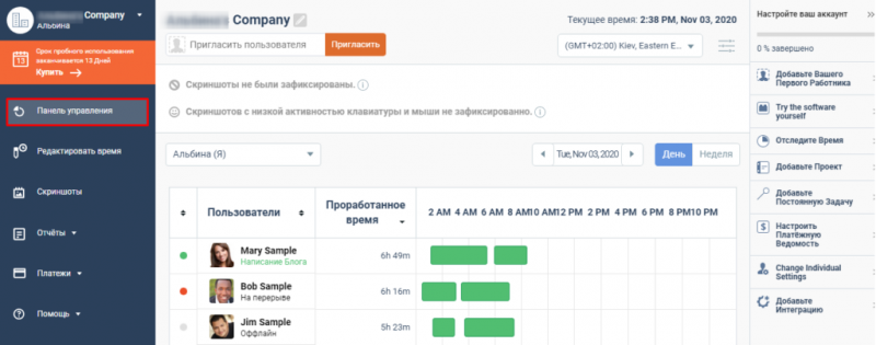Time Doctor имеет удобную панель управления. На ней отображается, сколько за рабочий день работал каждый участник и чем он занимается в данный момент.