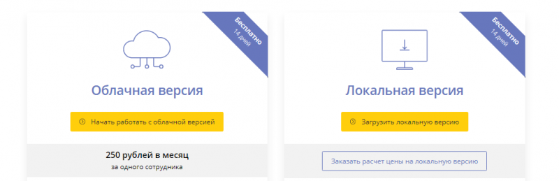 Бесплатный тестовый период — 14 дней. Далее использование облачной версии стоит 250 рублей в месяц на одного пользователя. Стоимость локальной версии рассчитывается индивидуально.
