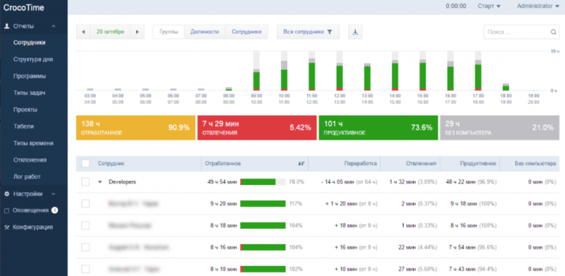 CrocoTime составляет фотографию рабочего дня в разрезе всего коллектива и каждого сотрудника по отдельности. Из отчета видно, сколько времени было потрачено продуктивно. Также в отчете фиксируется переработка, которая учитывается при подсчете оплаты труда.