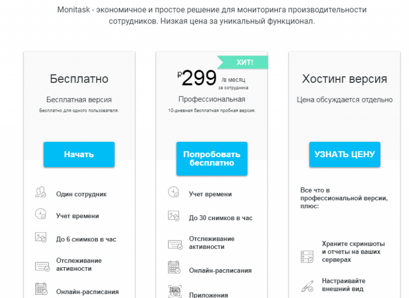 Версия «Профессиональная» стоит 299 руб. в месяц за сотрудника. Подходит, если надо получить полный доступ к возможностям Monitask.