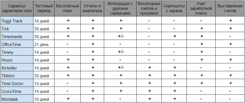 Прежде чем останавливать свой выбор на конкретном сервисе тайм-трекинга, посмотрите сравнительную таблицу. Здесь собраны возможности рассмотренных сервисов.