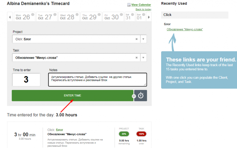 Tick отслеживает проекты и задачи в режиме реального времени. Для запуска тайм-трекера надо дать название проекту, поставить задачу, указать время ее выполнения и нажать на кнопку «Enter Time». После этого запускается обратный отсчет.