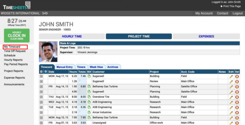 Сервис позволяет отследить время работы участников проекта для расчета заработной платы и выставления счетов. По каждому сотруднику ведется почасовый мониторинг выполнения заданий. Посмотреть их можно в разделе «My Timecard»: