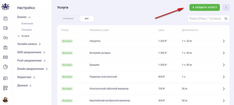 Чтобы виджет работал, а клиент мог записаться, кроме вышеперечисленных шагов нужно предварительно настроить график работы мастеров и добавить услуги. А также локации, если у вас не одно заведение, а сеть филиалов. Написали подробную инструкцию по заполнению этих разделов в шагах 2-4.