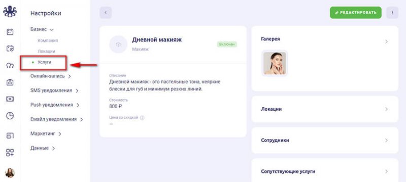 Все услуги доступны для редактирования. В списке кликаем на нужную. Кроме основных настроек можно добавить галерею с фотографиями (это дополнительно привлечет клиентов), отметить локации, где проводится услуга, привязать конкретных мастеров. А также добавить сопутствующие услуги. Например, к стрижке можно добавить возможность сделать окрашивание или кератиновое выпрямление волос.
