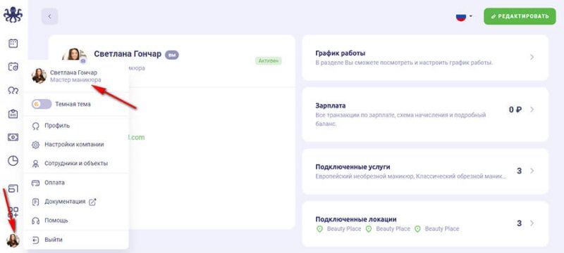 Частью процесса регистрации является внесение информации о компании: общие данные о владельце профиля, адрес и название организации. Адрес и название заведения (салона красоты, парикмахерской, барбершопа) фигурируют в виджете онлайн-записи и на лендинге. Контакты владельца позволяют восстановить доступ к сервису (например, если забыли пароль), быть на связи с техподдержкой не только в чате, а также своевременно получать информацию об обновлениях и новостях сервиса.