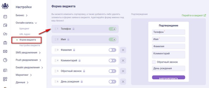 Во время записи клиент должен указать свои контактные данные. Это делается для того, чтобы менеджер мог перезвонить и уточнить факт записи. А также, чтобы избежать случайной записи. Настраивается в разделе «Настройки компании» — «Онлайн-запись» — «Форма виджета».