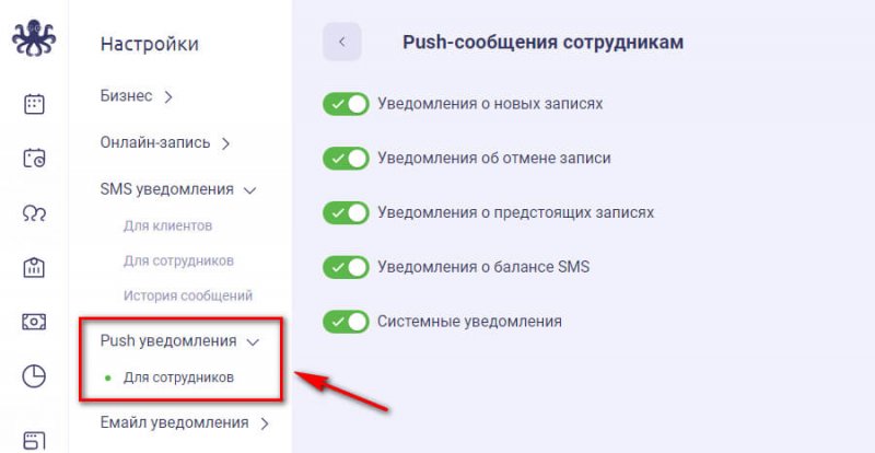 По умолчанию, все Push-уведомления включены. Включить и отключить их можно в разделе «Настройки компании» — «Push уведомления».