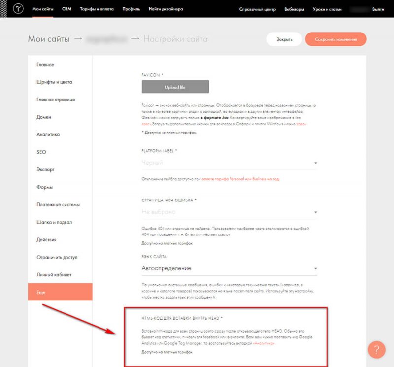 Нужно зайти в настройки сайта и открыть раздел «Еще». Спуститься до пункта «HTML-КОД ДЛЯ ВСТАВКИ ВНУТРЬ HEAD *» и нажать на редактирование.
