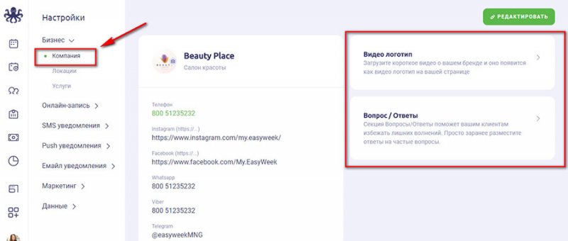 Дополнительно можно настроить основные цвета сайта (шаг 6 данной статьи — брендирование), добавить видео-аватар и блок вопросов и ответов. Последнее настраивается в разделе «Настройки компании» — «Бизнес» — «Компания».