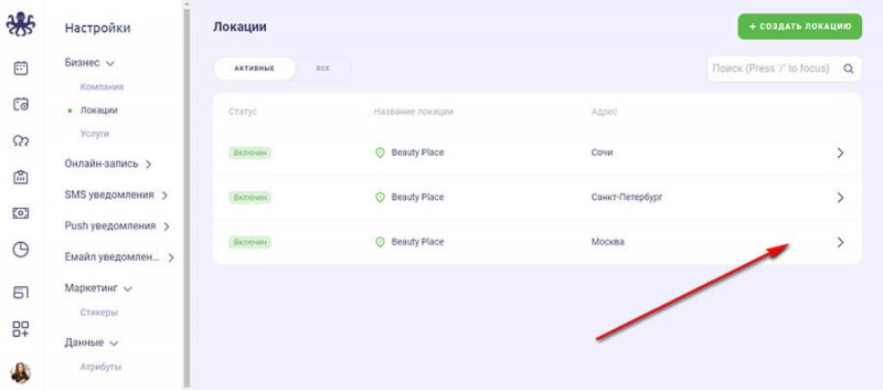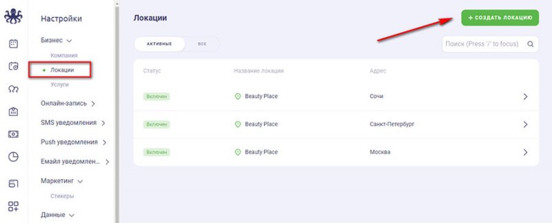 Во время онлайн записи, клиенту нужно знать точный адрес салона. Поэтому необходимо предварительно указать адрес заведения для виджета. Или нескольких заведений, если у вас сеть филиалов. Раздел «Локации» находится там же, в настройках компании.