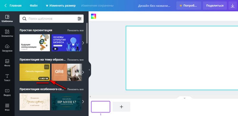 На главной Canva находим раздел «Презентация», кликаем. Разрешение 1920 х 1080 рх.