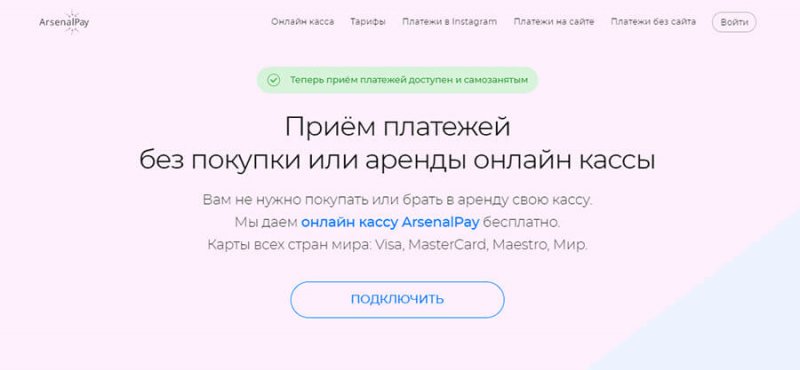 Онлайн-касса со встроенным эквайрингом ArsenalPay. Без необходимости отдельно покупать или арендовать оборудование. В отличие от большинства онлайн-касс эту кассу могут использовать самозанятые без лишней документальной волокиты — для подключения нужен только ИНН.
