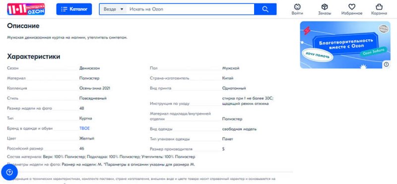 — Основные характеристики. Это целевая аудитория, размер, страна-изготовитель, пол, цвет, материал. Точные характеристики зависят от типа товара.