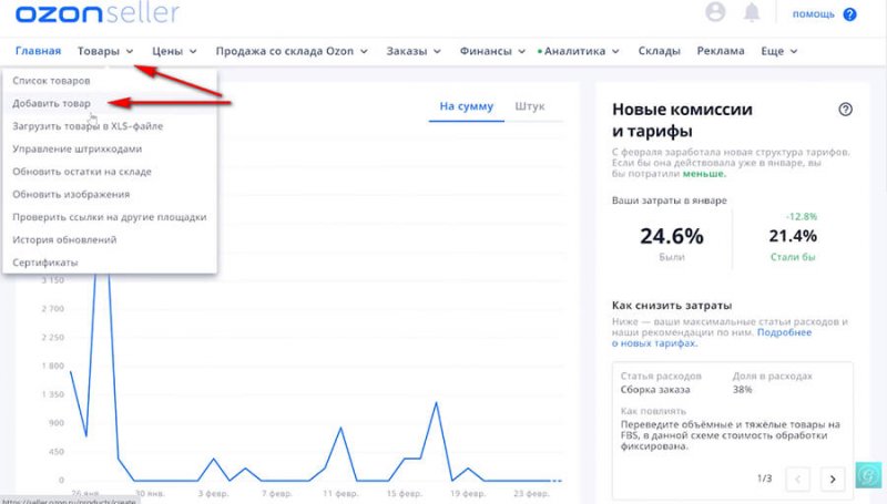 Шаг 2. Заходим в личный кабинет Озон. Аккаунт должен быть подтвержден. Находим раздел «Товары» — «Добавить товар».