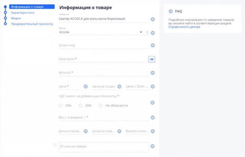 Шаг 2. Вводим основную информацию по товару. Поля, отмеченные звездочкой, обязательны к заполнению. Но лучше заполнить максимум информации, которая у вас есть. Чем больше данных — тем лучше ранжируется товар.