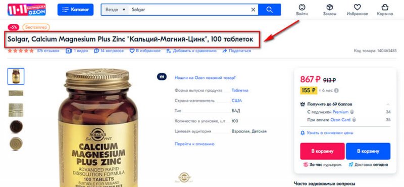 - составляем название, по которому ваш товар могут найти в поиске. Например, Solgar, Calcium Magnesium Plus Zinc «Кальций-Магний-Цинк», 100 таблеток. Тут отражено и название производителя и состав и количество таблеток. Но если это не специфический товар (в данном случае БАД), а, например, одежда, то может быть достаточно типа товара и бренда. Например, «Куртка ТВОЕ». Если можно сузить критерии поиска — сужаем, например «Черное вечернее платье ТВОЕ».