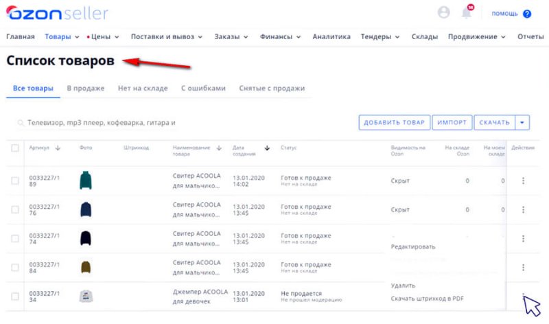 Список товаров со статусами отображается в разделе «Товары» — «Список товаров».