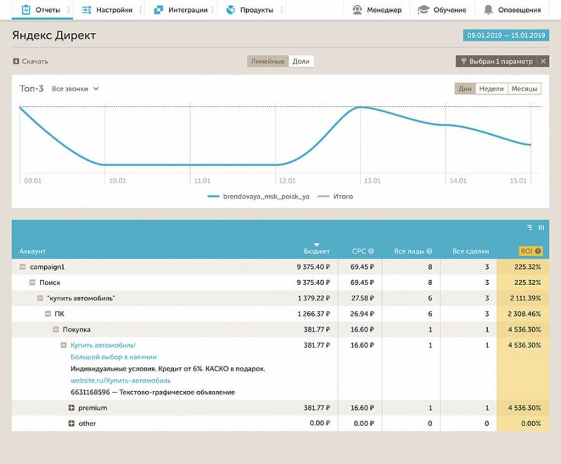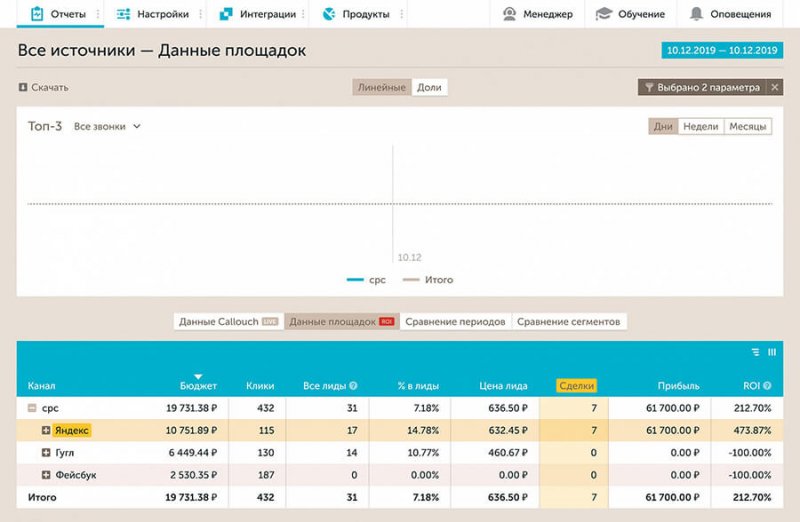 Calltouch — это сервис, который объединяет максимальное количество отчетов для аналитики рекламных кампаний. Его однозначно стоит использовать, если вы запускаете рекламу и хотите знать о ней все — какая реклама приводит клиентов, какая нет, на каком канале привлечения вложения окупаются и приносят прибыль, а где вы теряете деньги. Плюсом идет возможность контролировать эффективность работы сотрудников и наличие коллтрекинга (не нужно искать отдельный сервис для отслеживания и записи звонков).