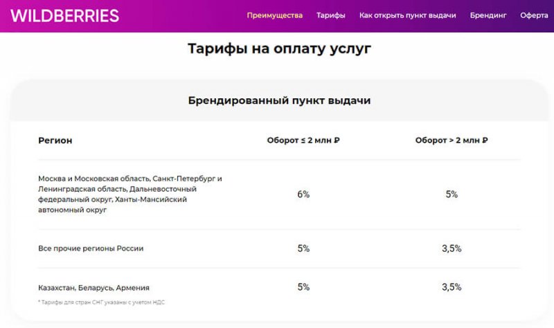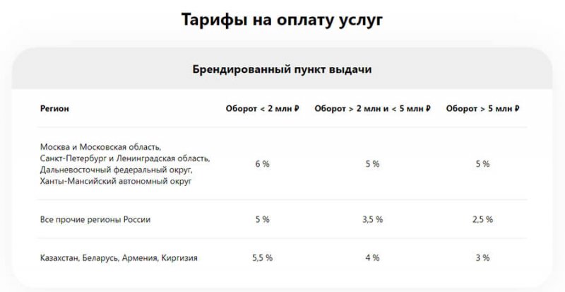 Тариф зависит от вида ПВЗ, региона и месячного оборота.