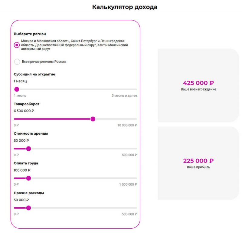 Также на странице WB Point — партнерских ПВЗ (point.wb.ru) есть калькулятор, по которому можно рассчитать примерный доход с учетом региона, товарооборота, стоимости аренды, зп сотрудникам и прочих расходов.