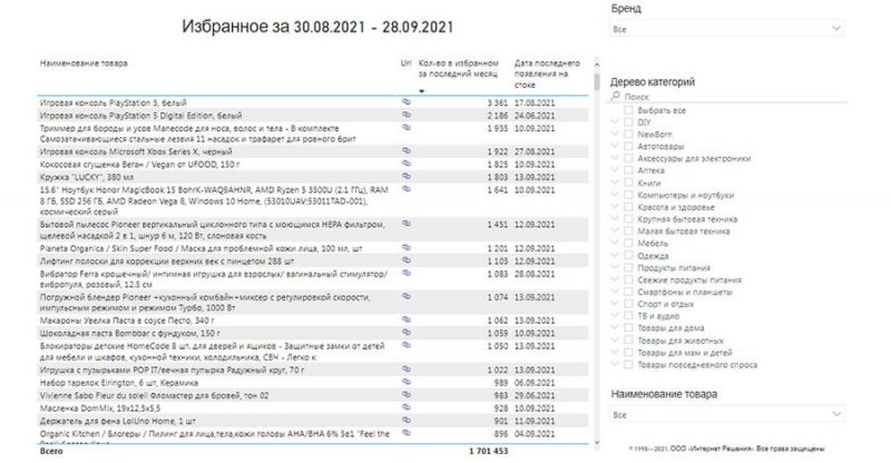 Пример отчета. Можно посмотреть название товара (есть ссылка с переходом на карточку), количество добавлений в избранное и дату последнего появления на стоке. Базу можно отфильтровать по бренду, категории и названию товара.
