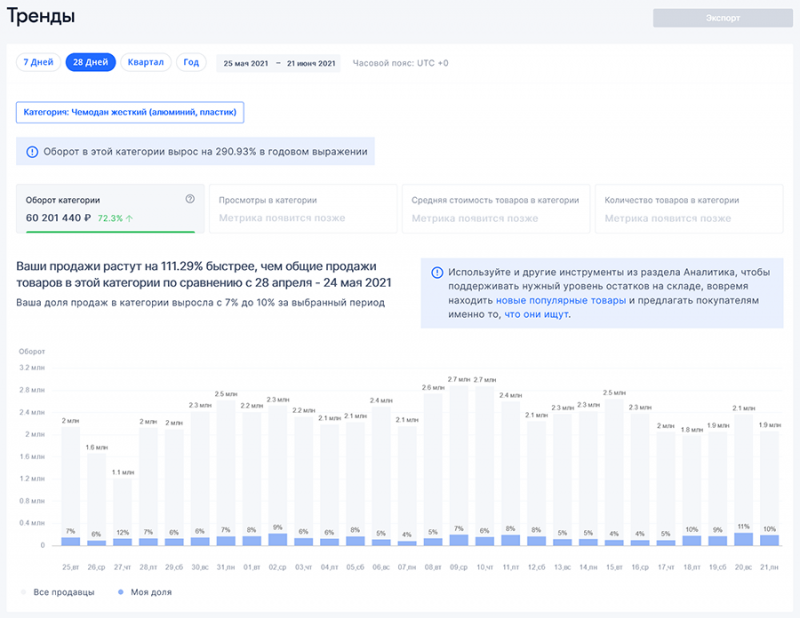 1. Тренды. Озон показывает оборот категории на основе динамики ваших продаж. Обратите внимание, этот отчет доступен, когда вы уже продаете товар на Озон.